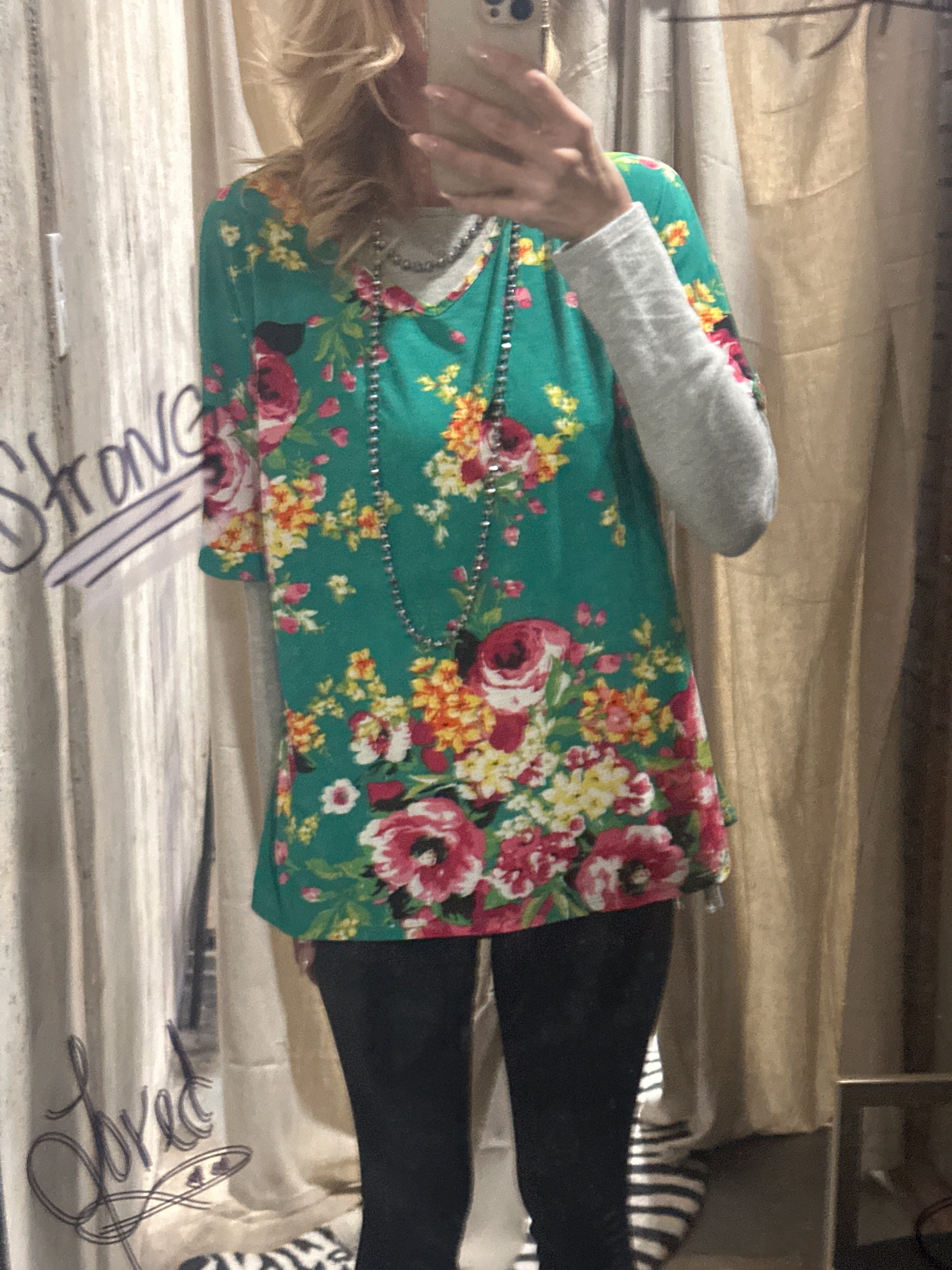 Unleash the power of florals with our Green Bloral top! Made with 96/4 polyester spandex blend, this v neck top is perfect for fall. Embrace your unique style with its quirky green color and playful floral pattern.