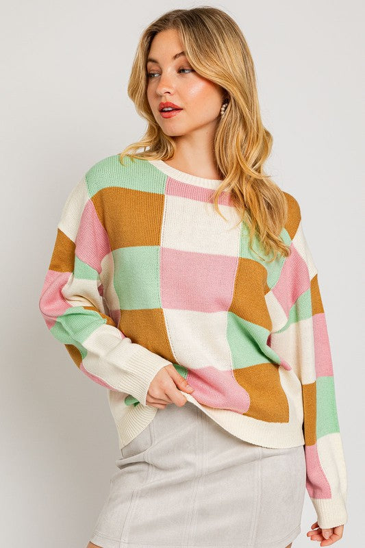 Transition into spring with our Pastel Checkered Sweater. Made with lightweight and breathable fabric, this sweater is perfect for those in-between weather days. Stay stylish and comfortable while embracing the changing of the seasons.