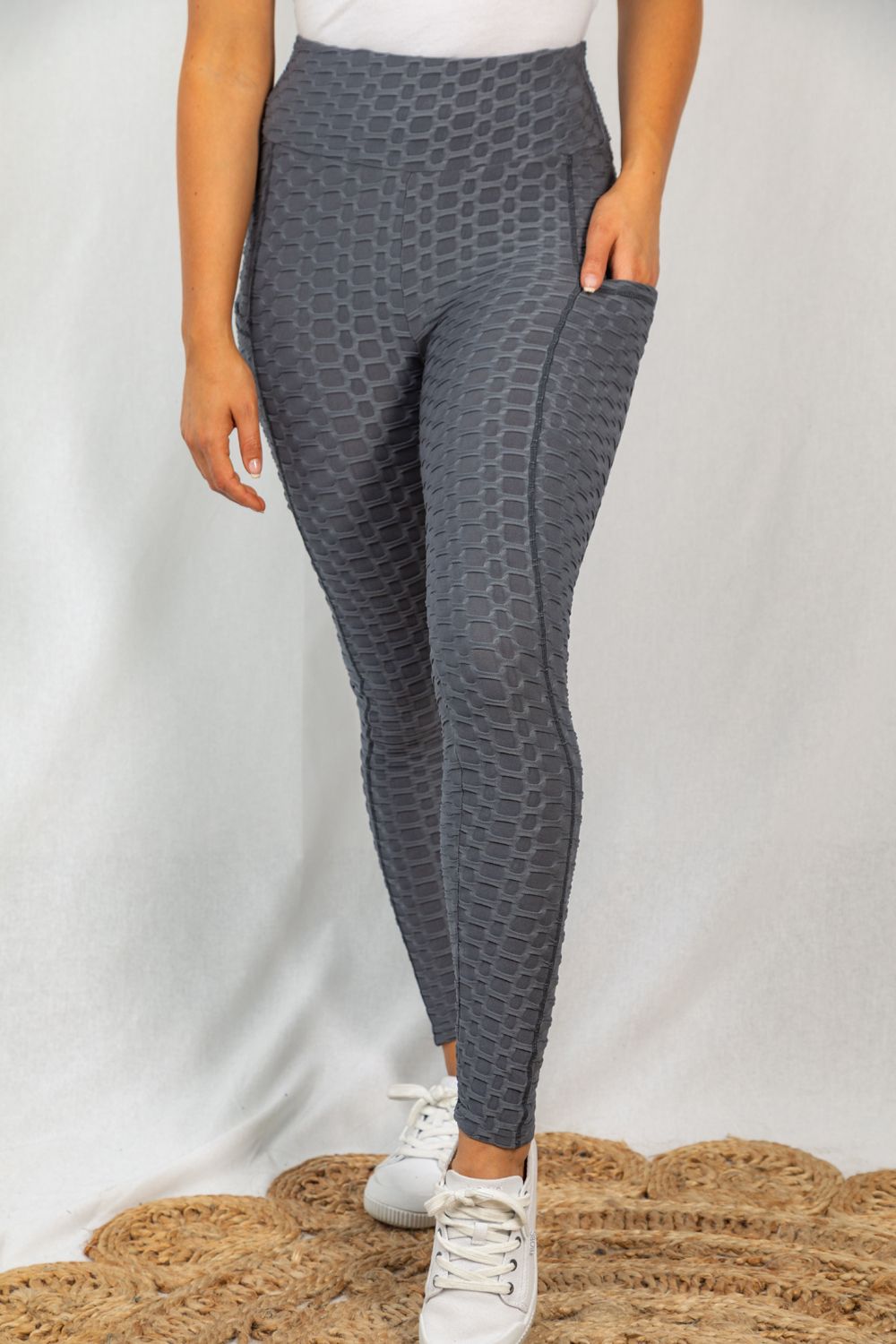 "Upgrade your active wear game with these Textured Leggings. The high-waisted design and wide yoga waistband provide a comfortable fit, while the side pockets and contoured back seamline add functionality. Made with a lightweight textured knit, these leggings are perfect for workouts or everyday wear. 92% polyester, 8% spandex."