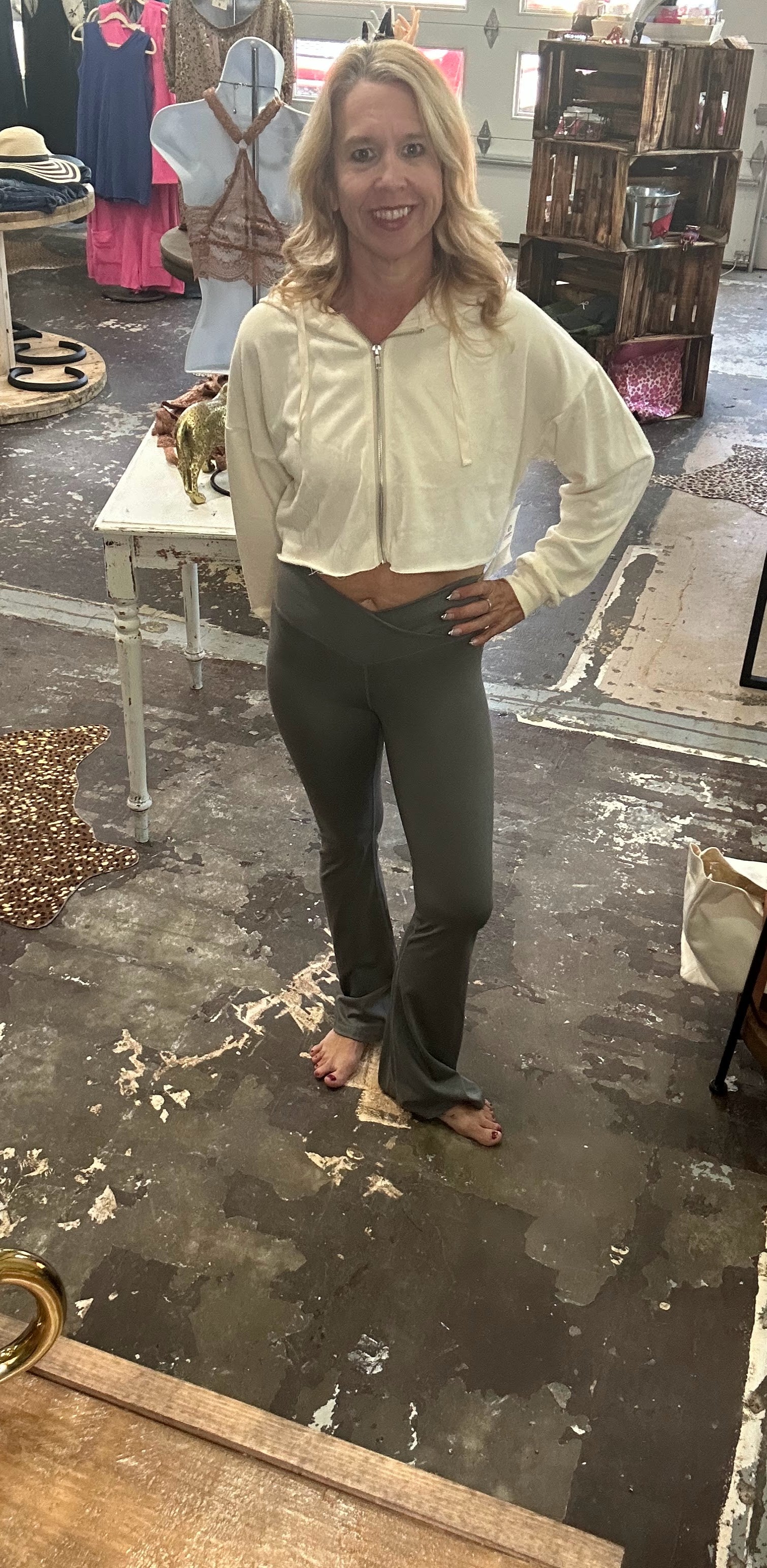 Slip into the Venice Crossover Waist Yoga Pants for a buttery soft feel that moves with you. Crafted from a cozy blend of 78% polyester and 24% spandex, these pants offer a slimming fit with a mild flare leg that adds a fun twist to your workout or lounge time. The new pewter color and crossover waist design bring playful style and comfort together perfectly.