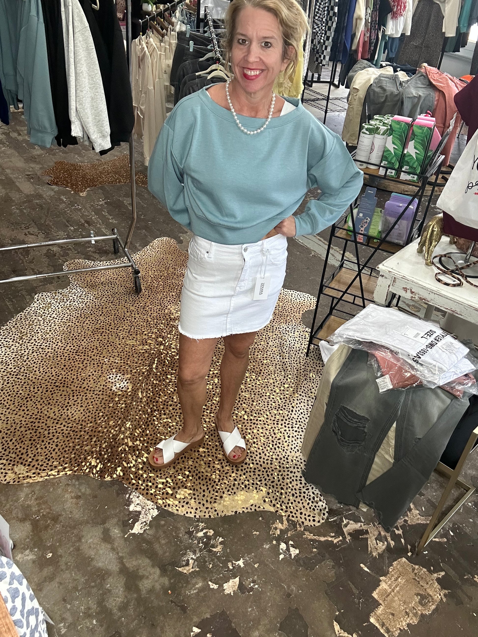 Step out in style with this playful white denim skirt featuring a trendy distressed hem. Its casual, fun design adds a cool edge to any outfit, perfect for sunny days and spontaneous adventures. Pair it with your favorite tee or a cute blouse for effortless charm.